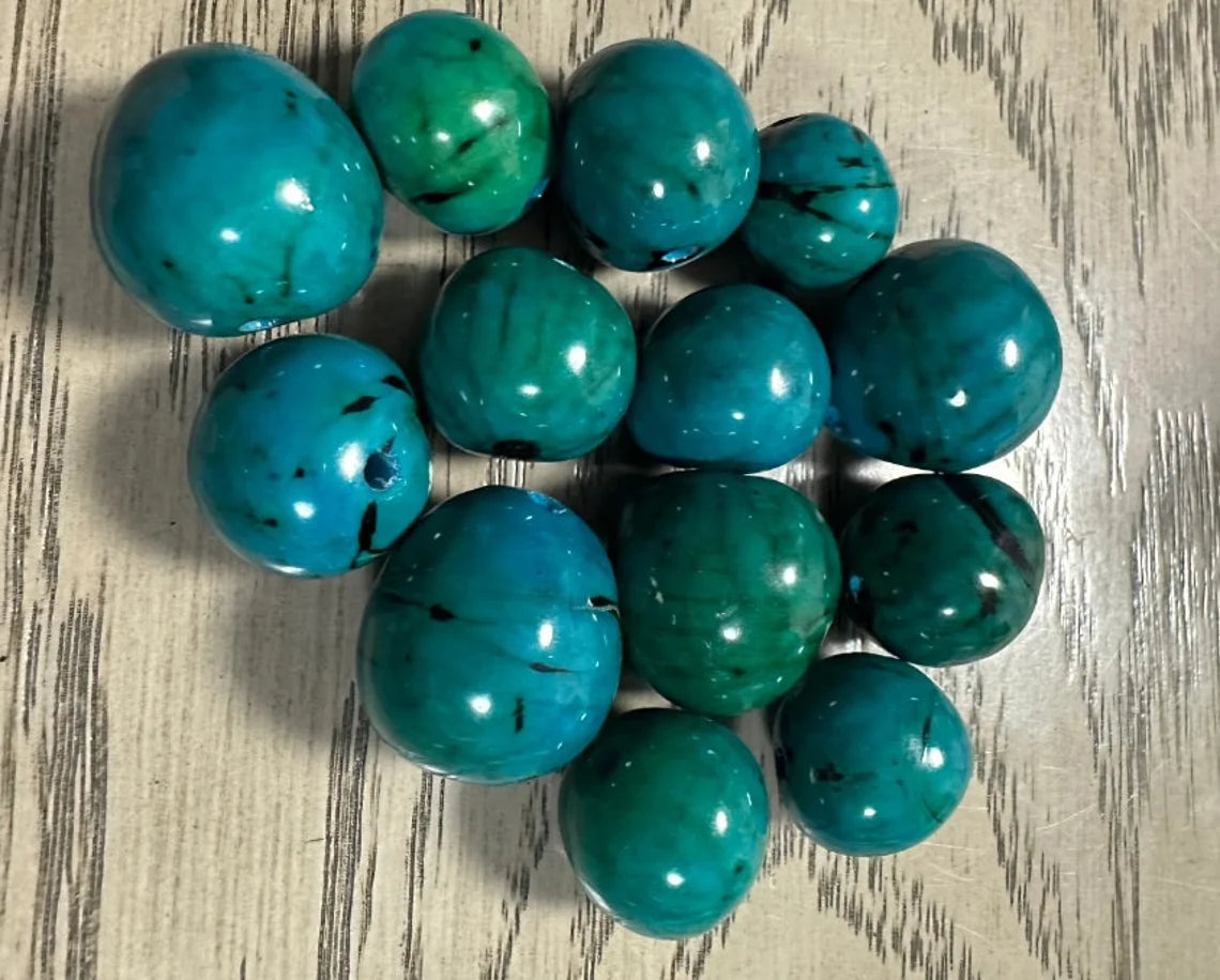 20 Bombona Beads / Seeds in Blue - Green Color. Size: 1.5 - 2 cm. approx. Handmade in Colombia. Eco, Vegan, Natural Jewelry Making Supplies