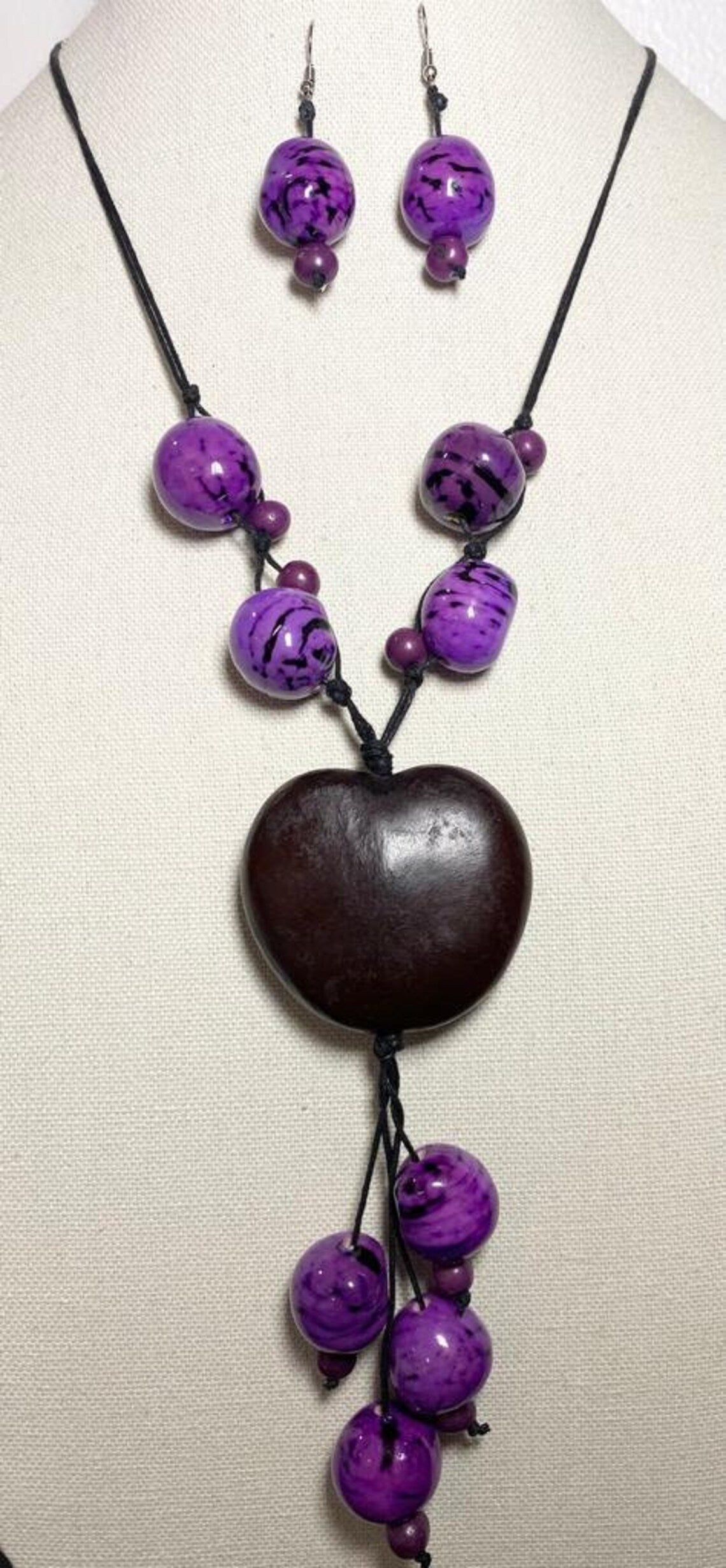 Tagua Pendant Necklace and Earrings Set in Purple Color