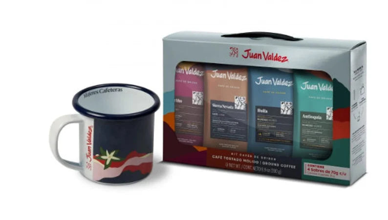 Coffee Lover Gift Box. Peltre Mug + 4 Flavors of Coffee from the Mountains of Colombia. Ground Coffee Juan Valdez Premium 4 Sachets.