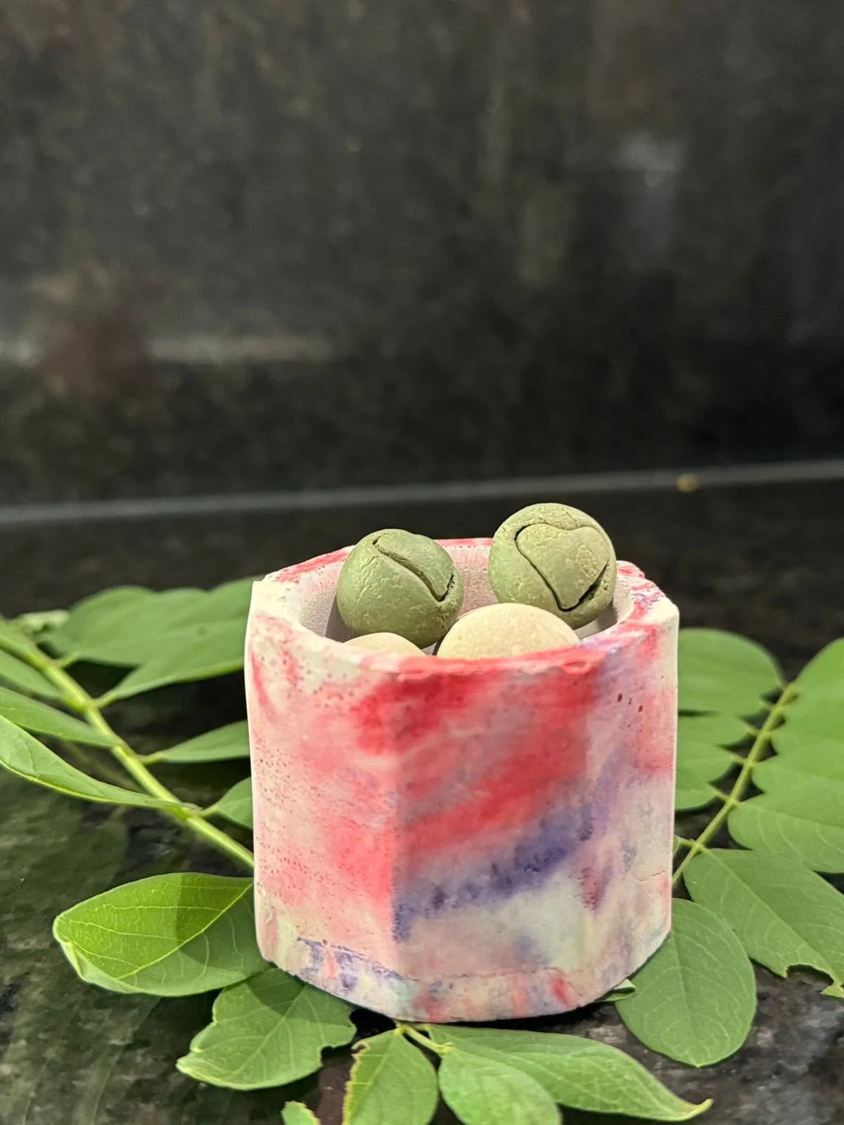 6 hand rolled round shape clay stones: 4 in white clay and 2 in green clay