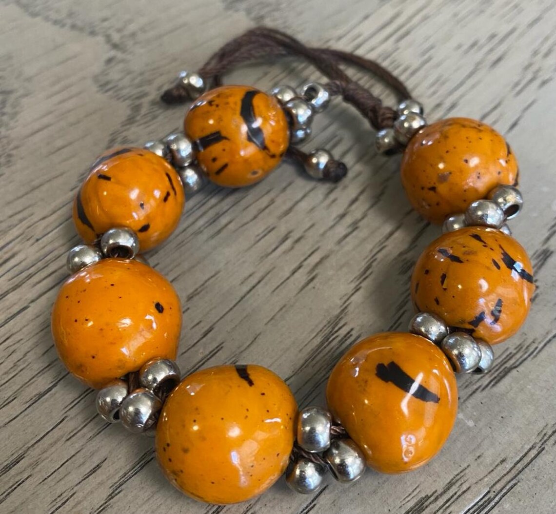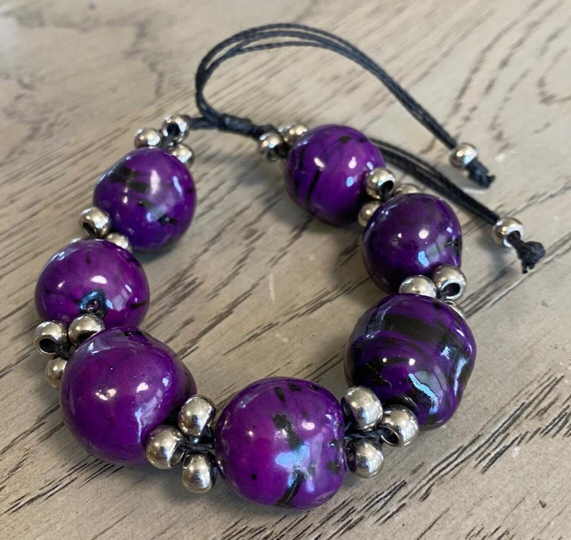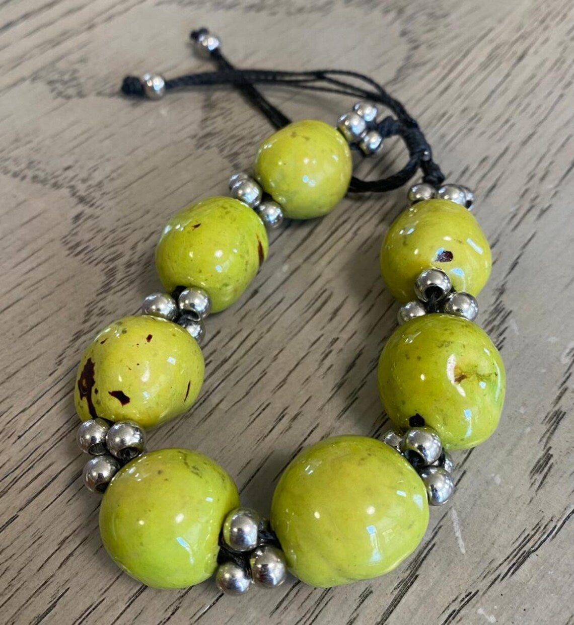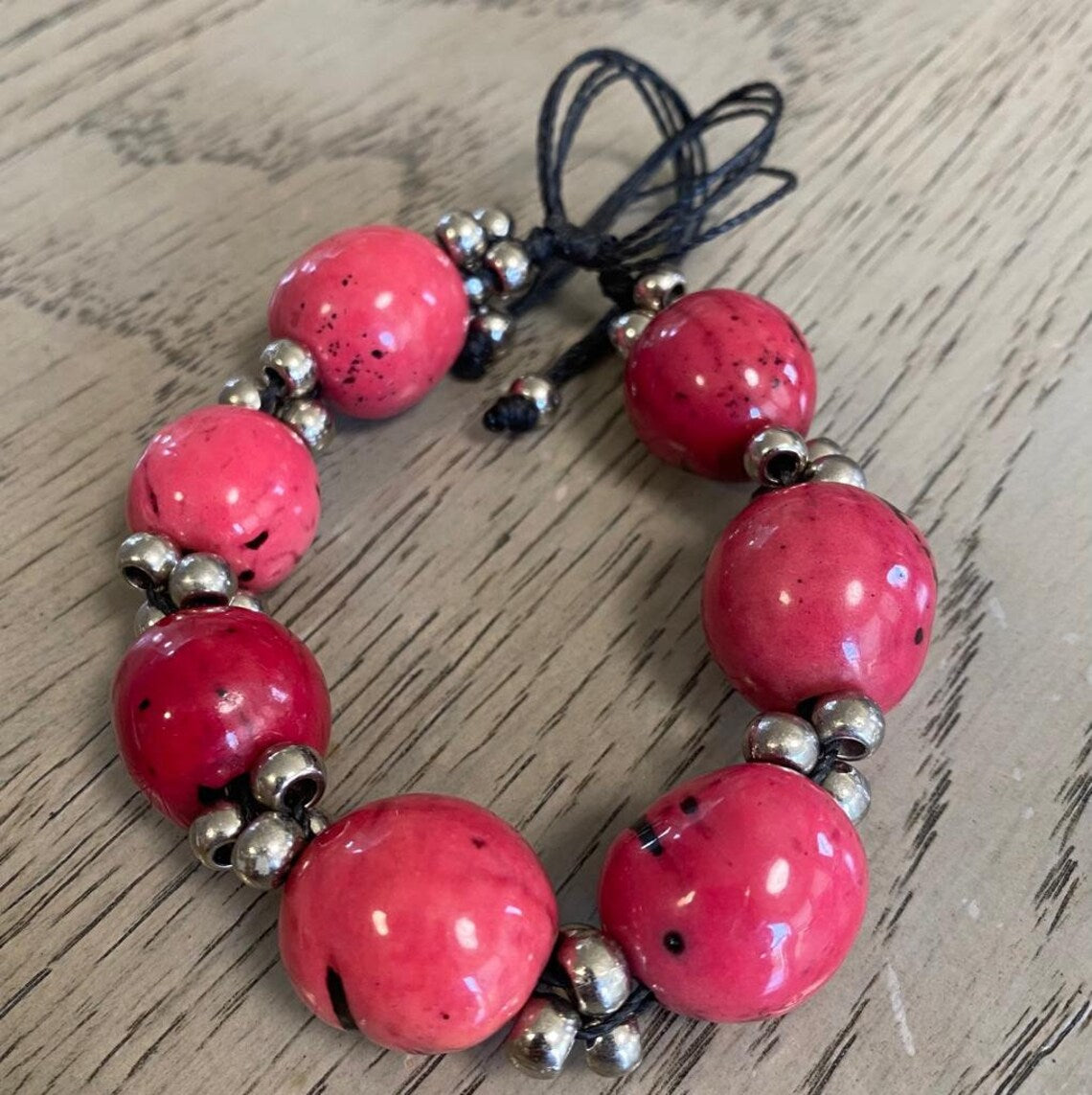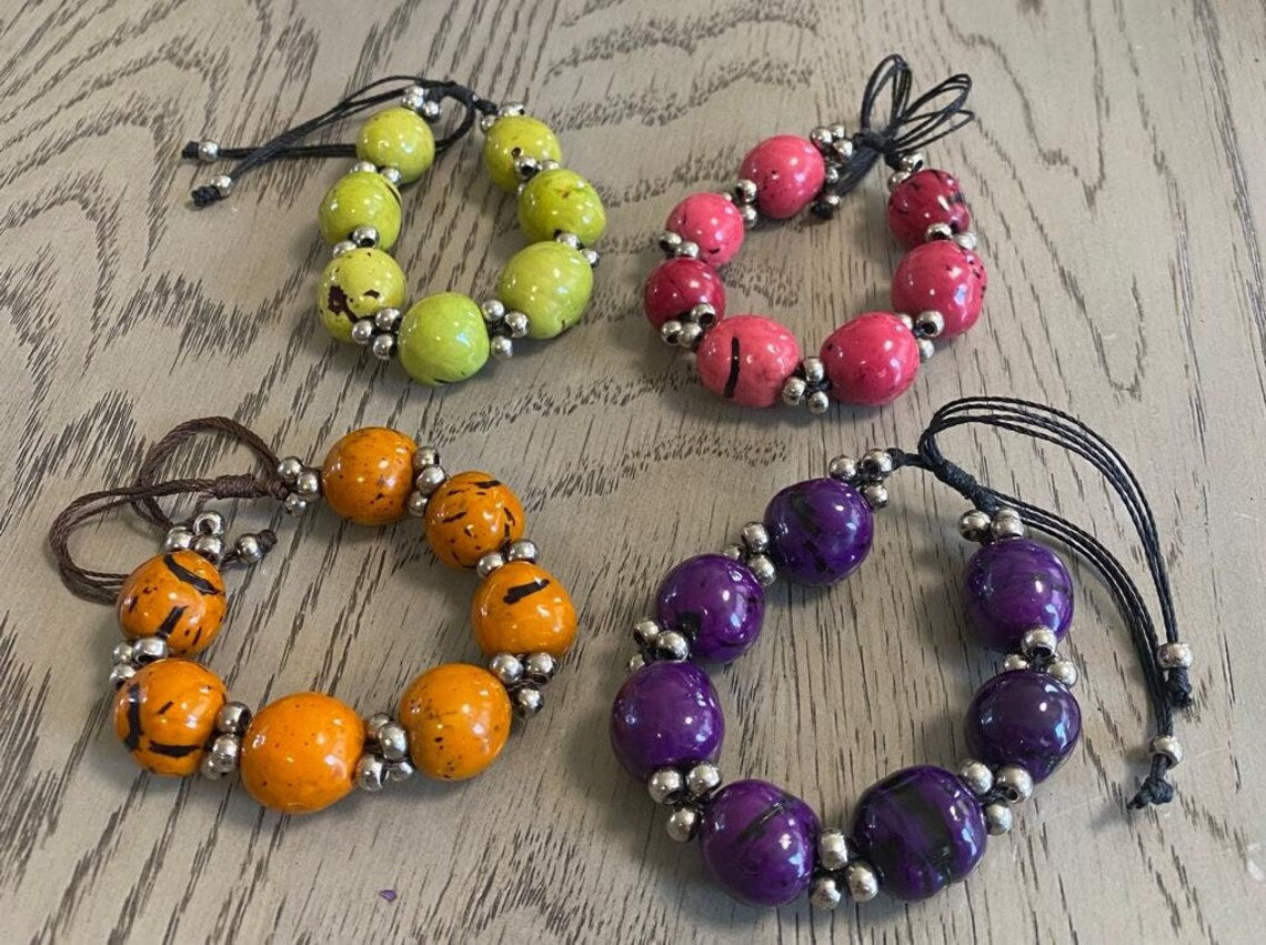 This bracelet is handmade. Colombian artisans hand-carved bombona and peach seeds, tint them in simmering pots of colorful dye and assemble the pieces into different shapes, color and sizes.