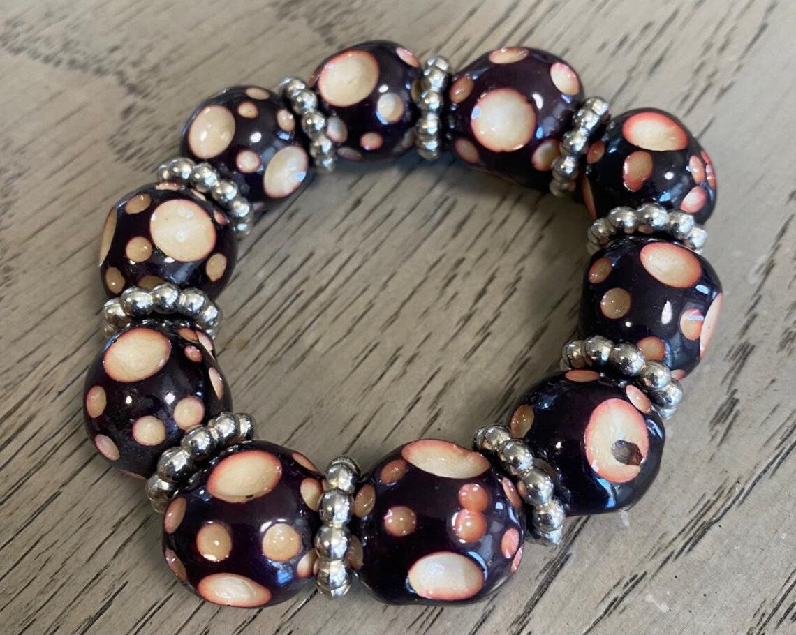 This bracelet is handmade. Colombian artisans hand-carved bombona and peach seeds, tint them in simmering pots of colorful dye and assemble the pieces into different shapes, color and sizes.