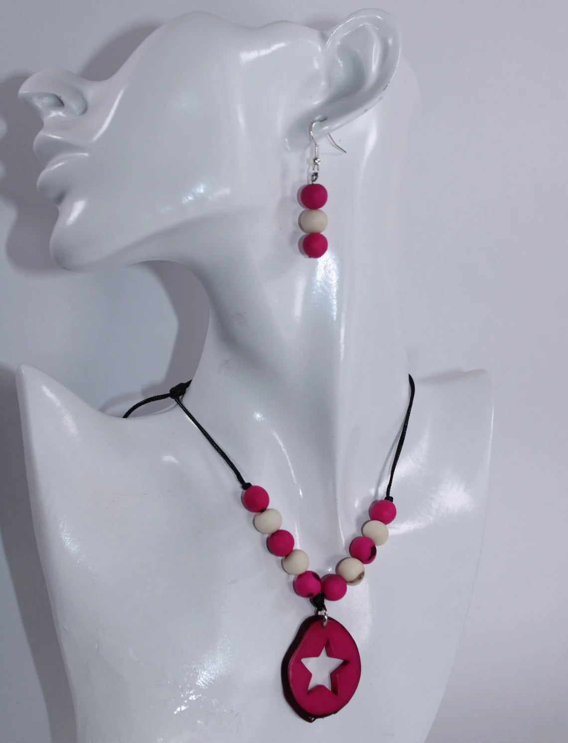 Tagua Pendant Necklace and Earrings Star Cut Set in Pink Color