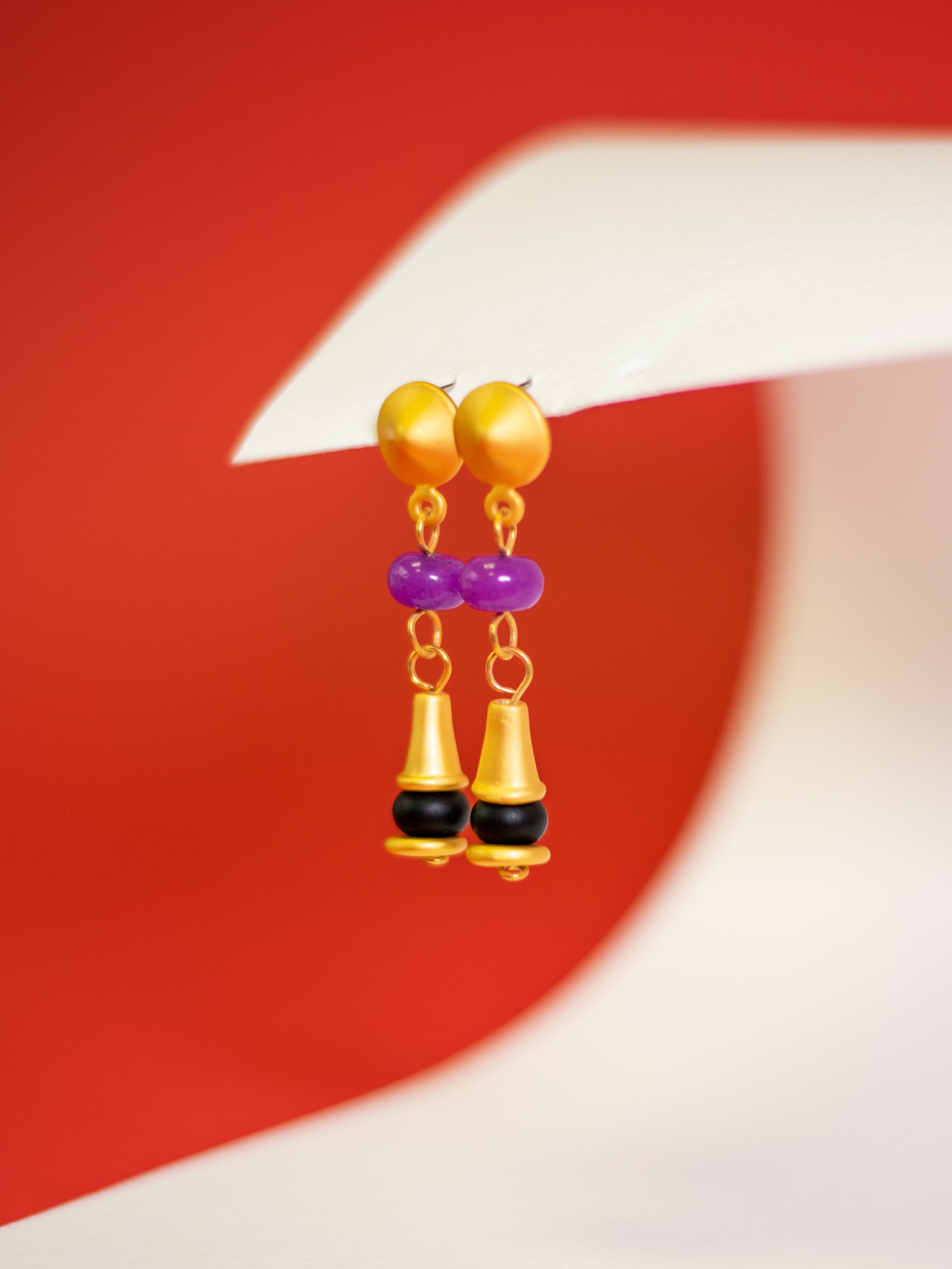 Pre-Columbian Muisca Golden, Black and Purple Set. Pre-Columbian Jewelry plated in 24k Gold. Contains Bracelet and Earrings