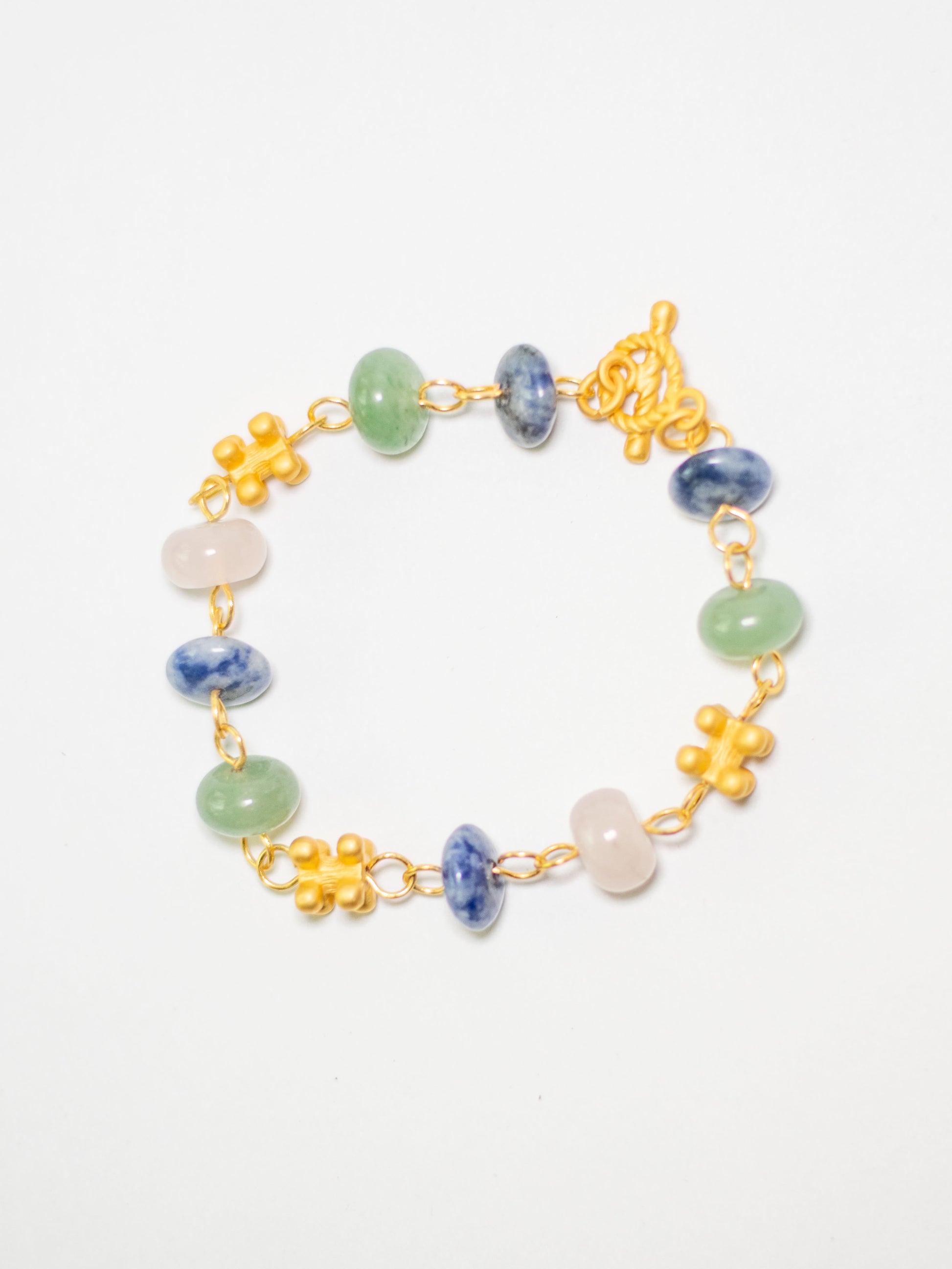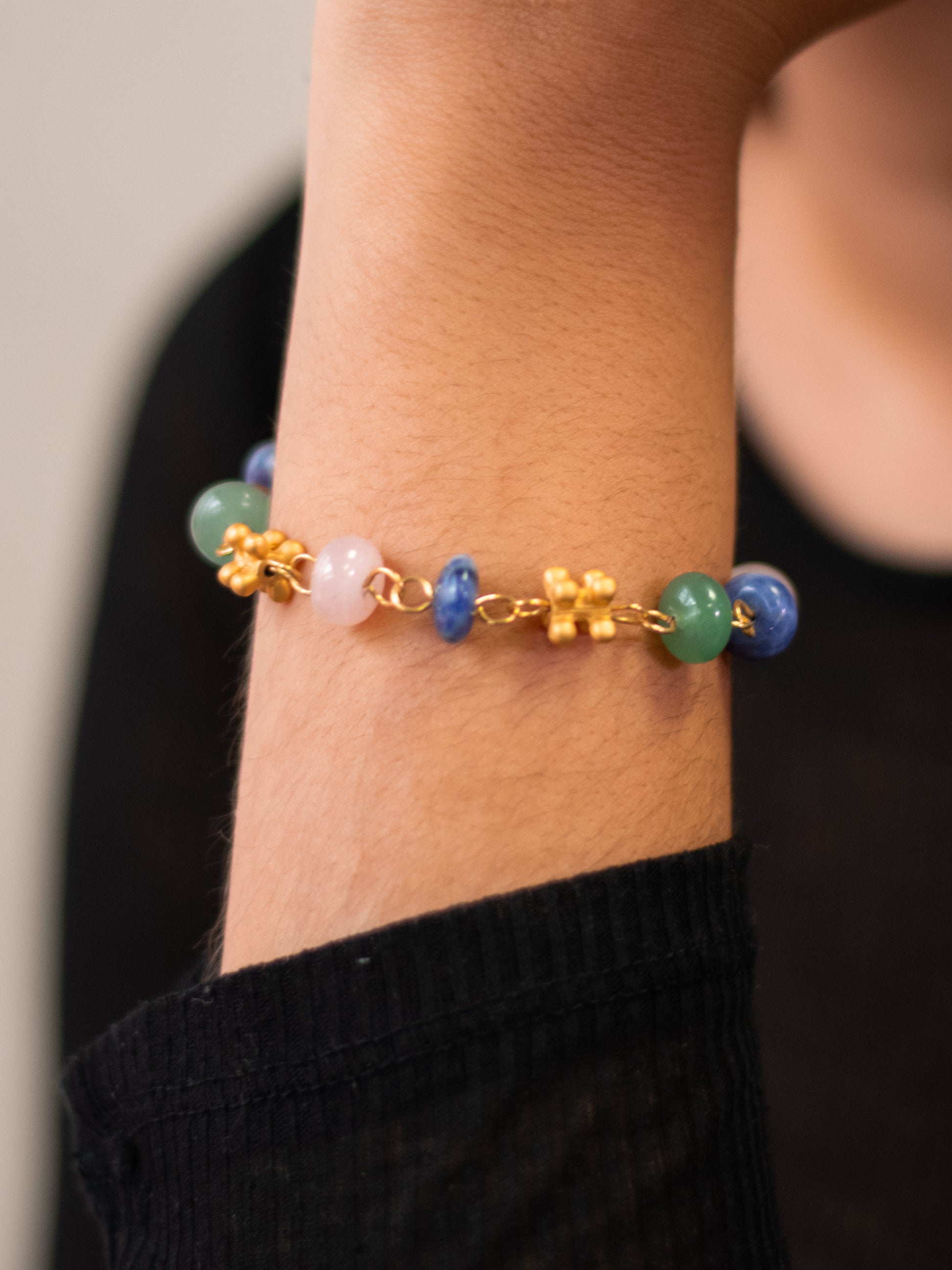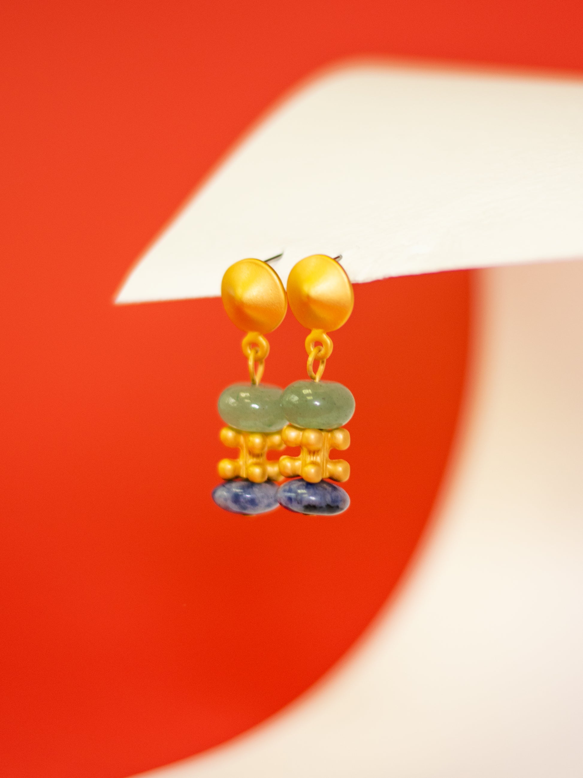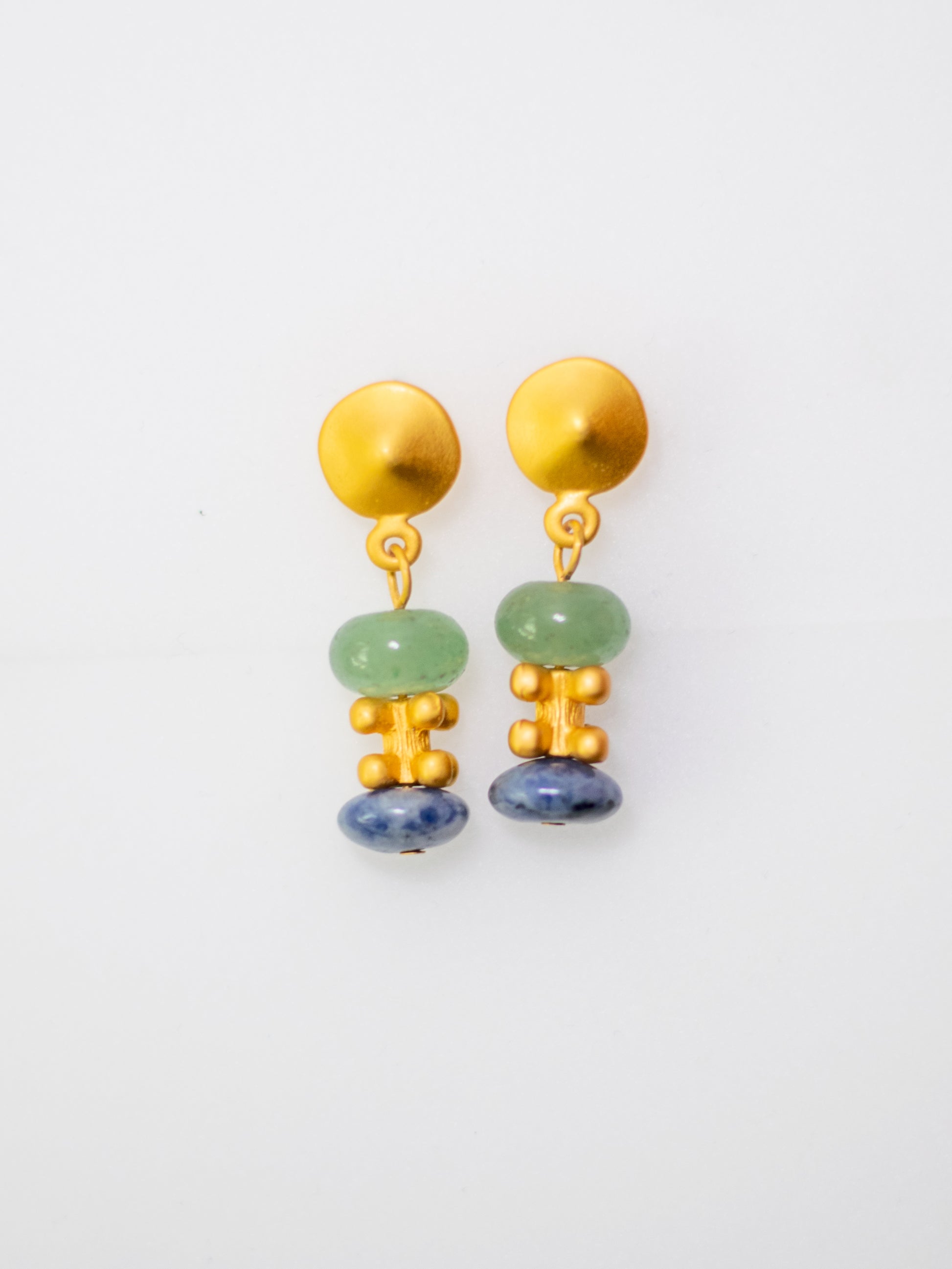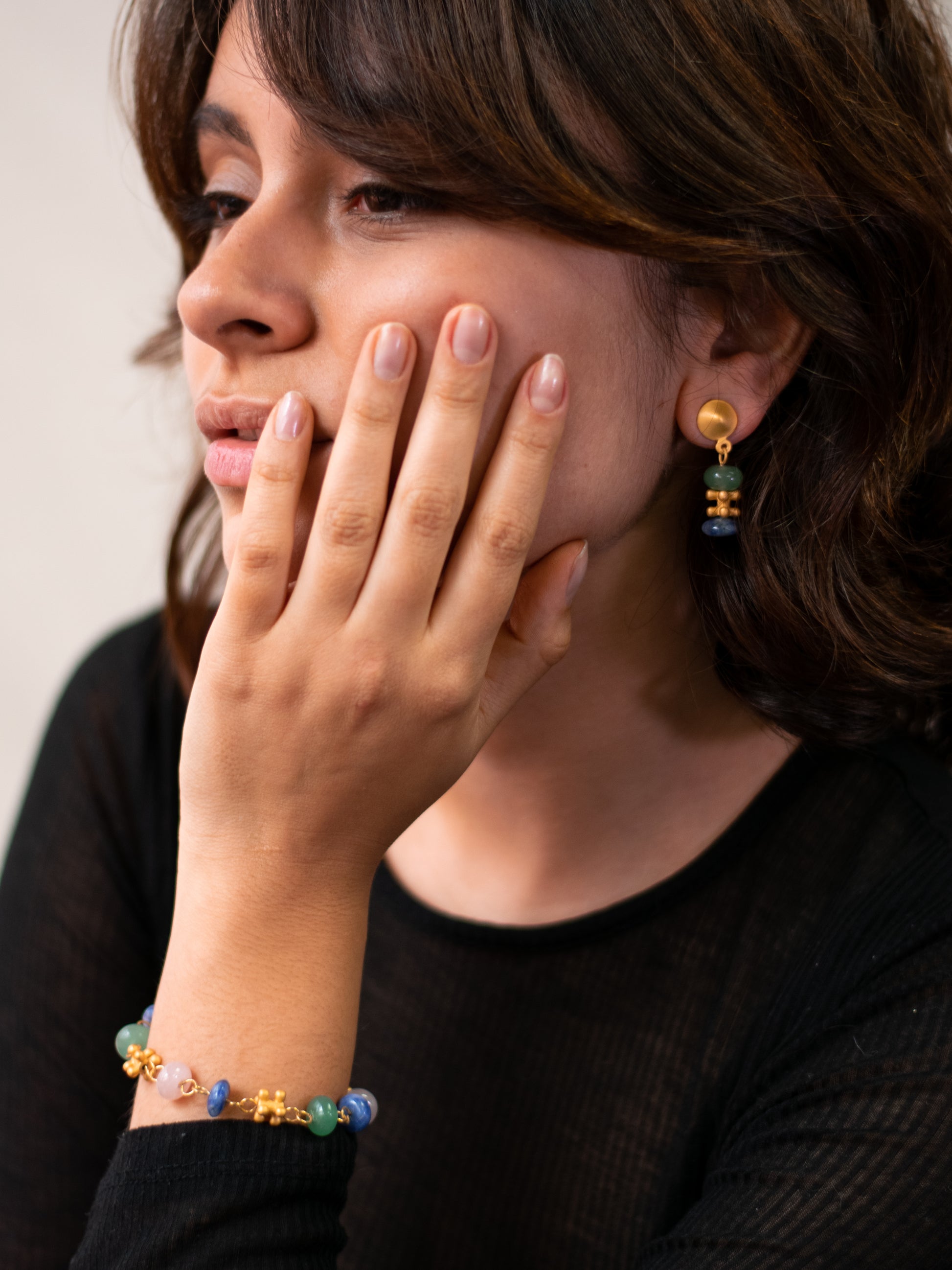 Pre-Columbian Muisca Golden, Blue and Green Jewelry Set. Pre-Columbian Jewelry plated in 24k Gold. Contains Bracelet and Earrings