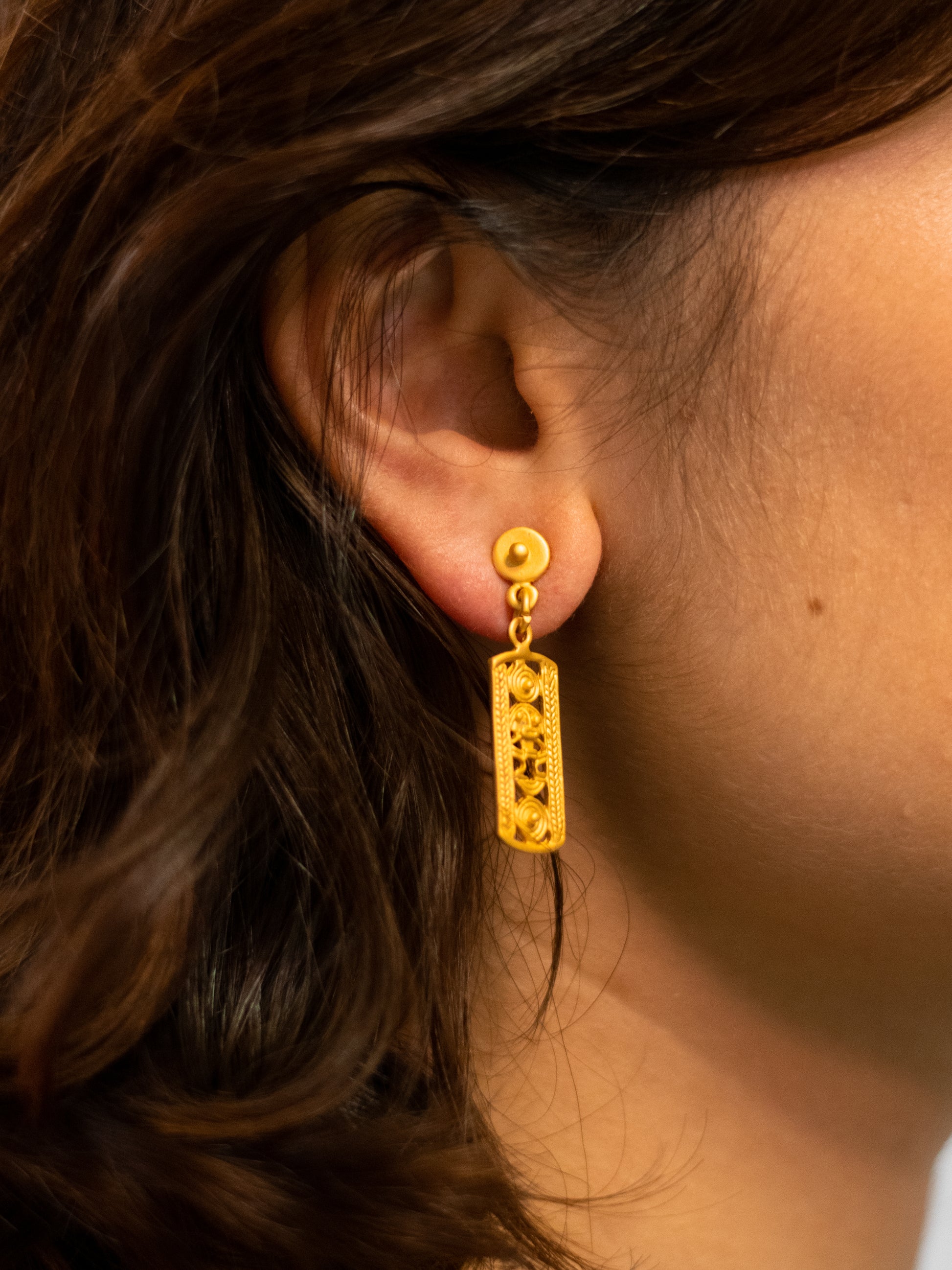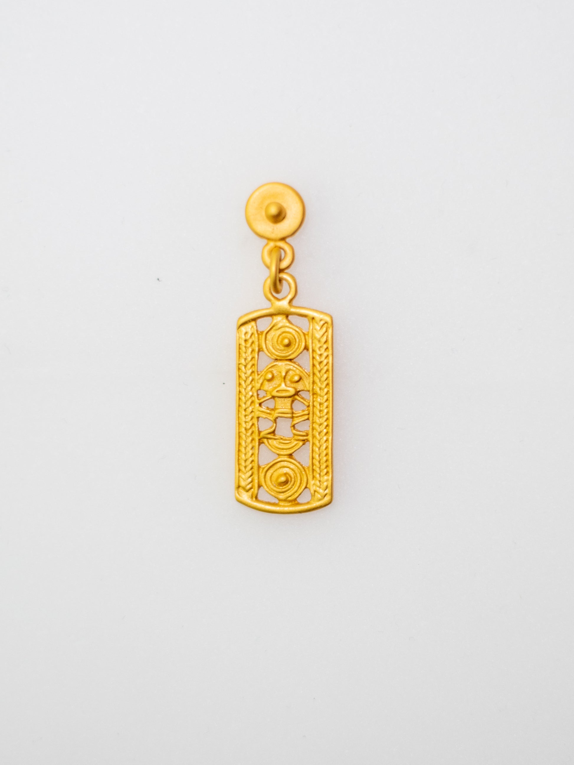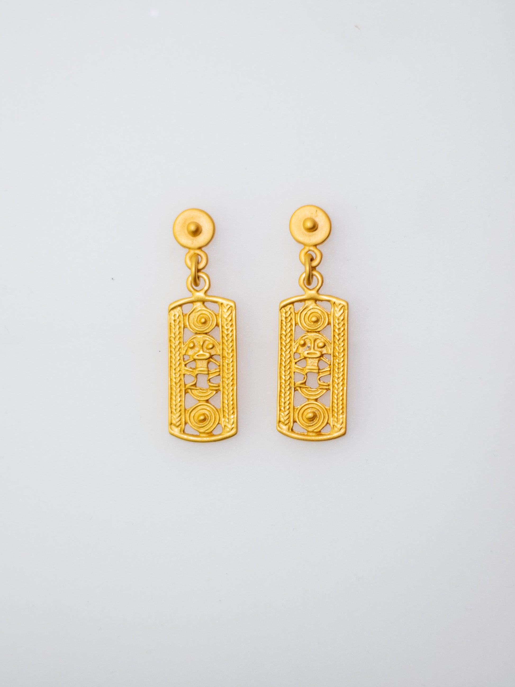 Based on the gold pieces created by pre-Hispanic cultures, earring design based on reproductions of original pieces exhibited in the Colombian Gold Museum.