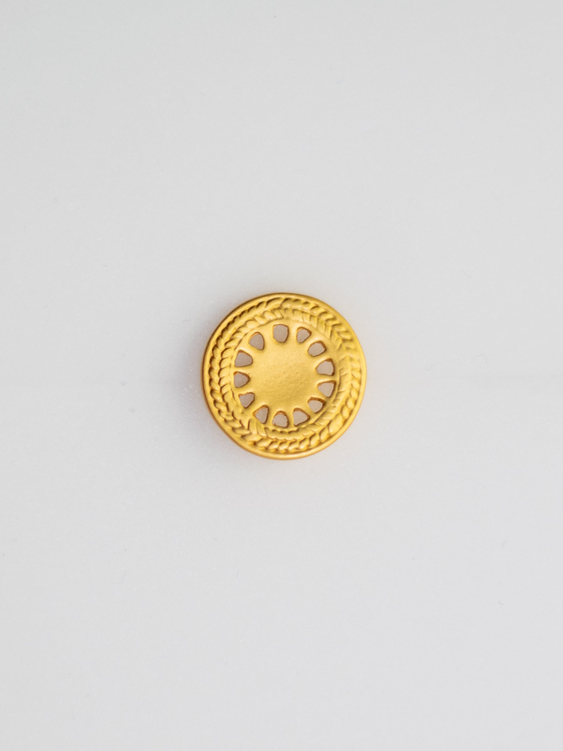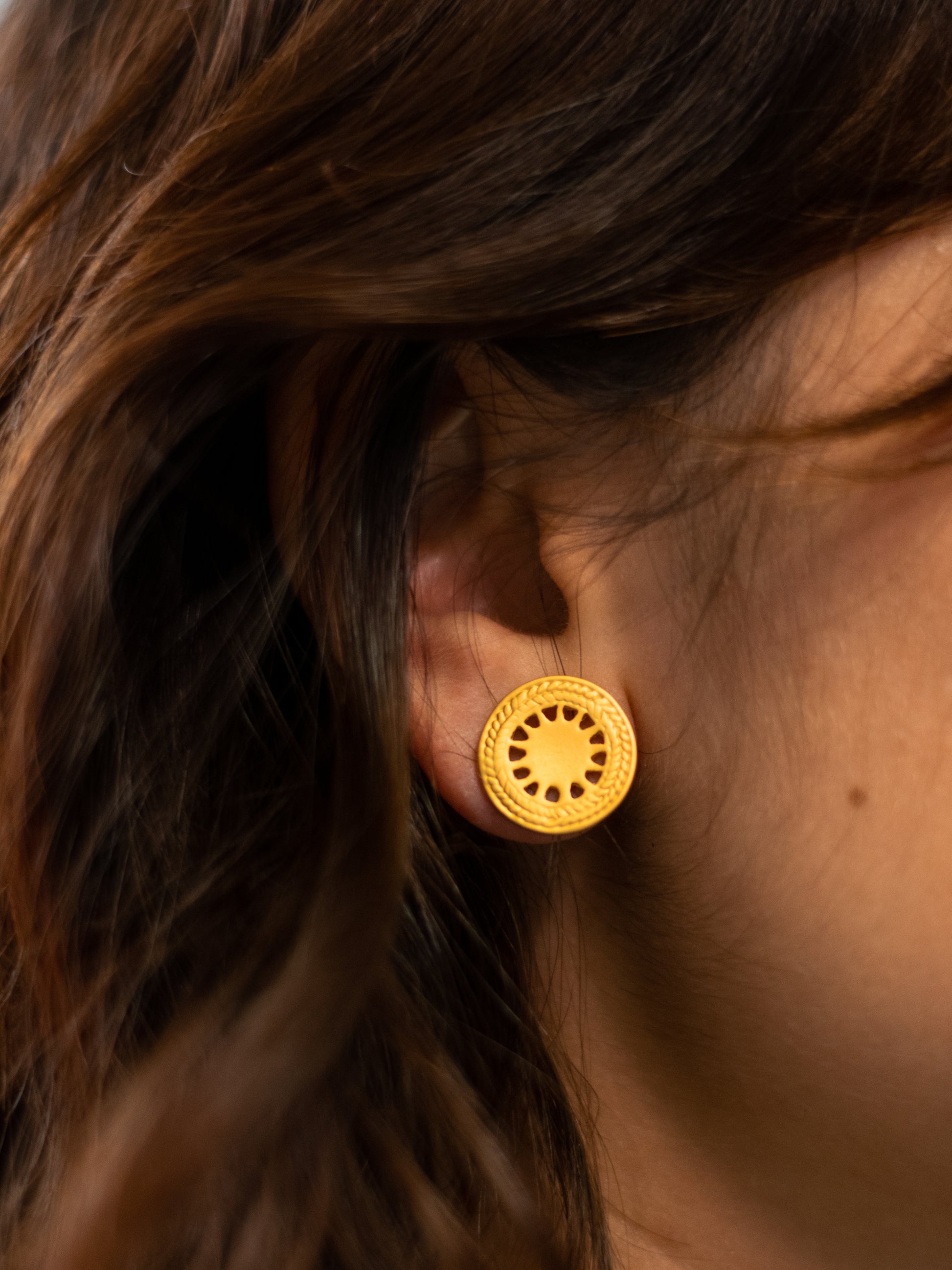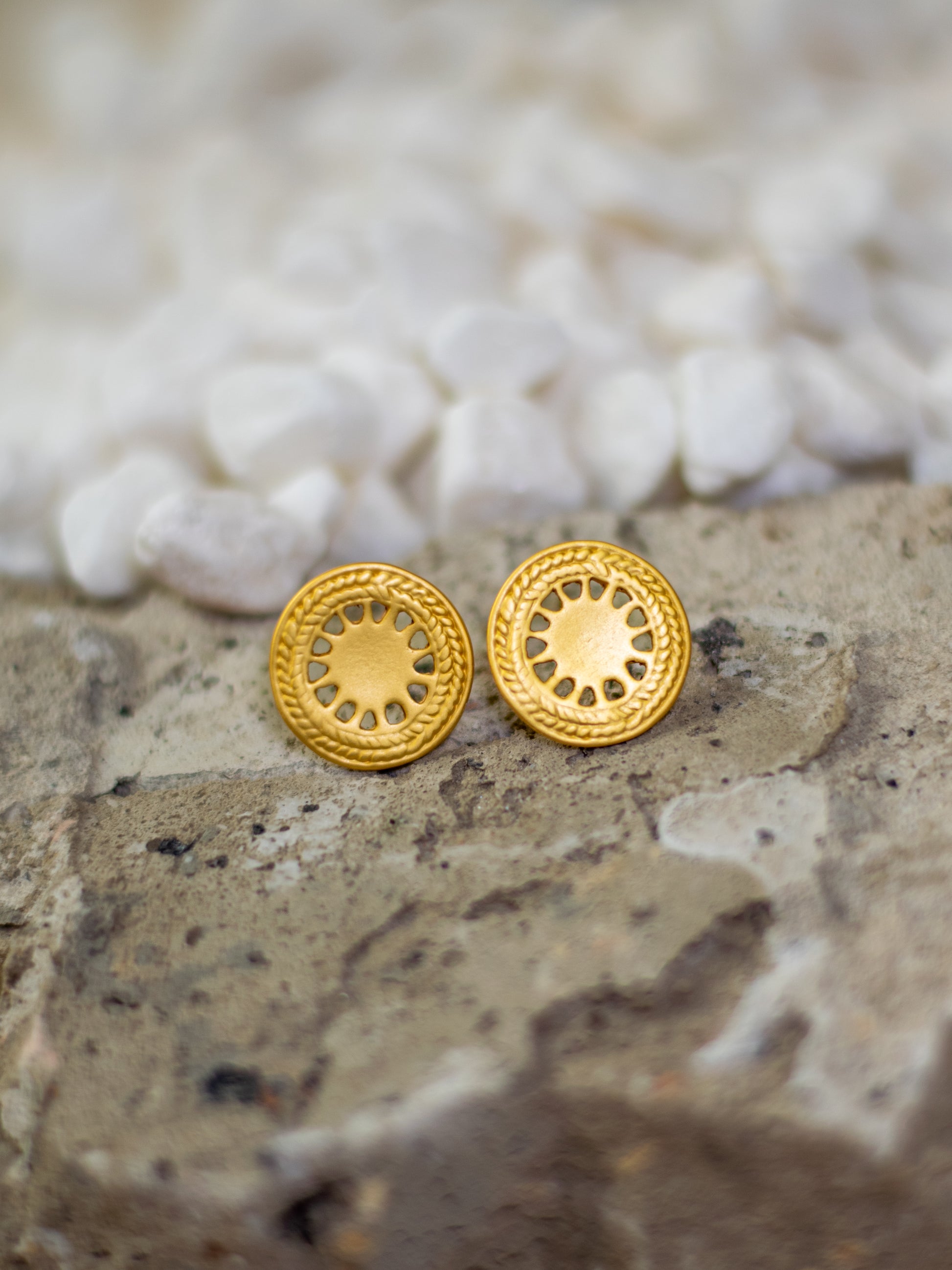 Pre-Columbian Muisca (Nariño) pattern round earrings plated in 24K gold. Museum reproduction. Handcrafted in Colombia.