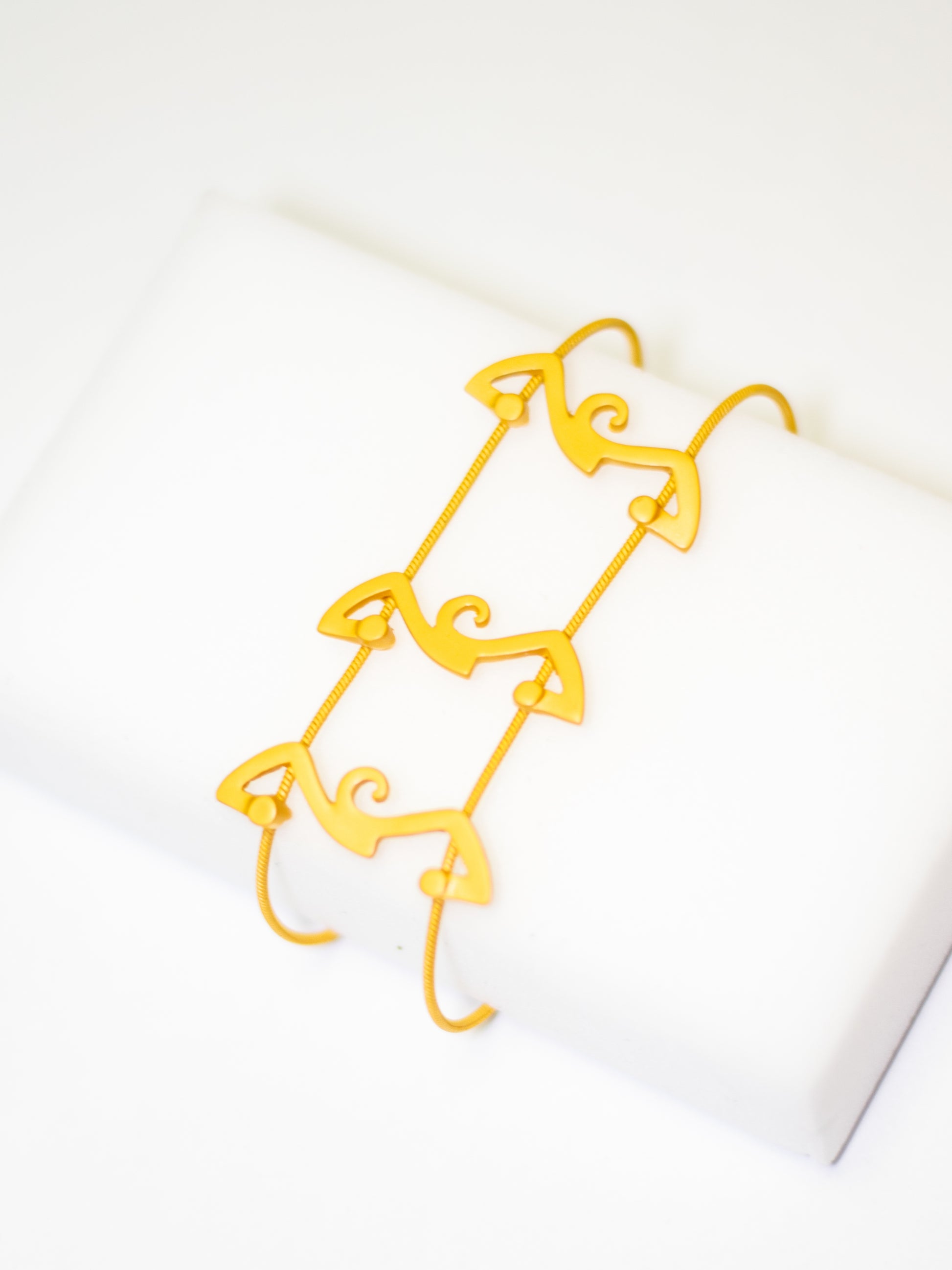 Based on the gold pieces created by pre-Hispanic cultures, bracelet design based on reproductions of original pieces exhibited in the Colombian Gold Museum.