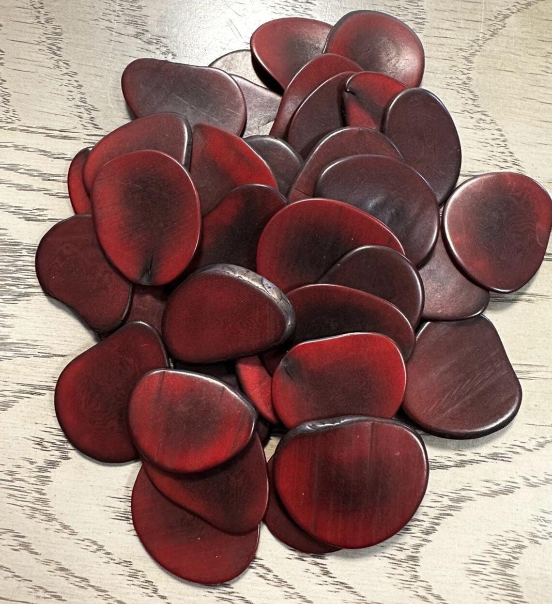 Tagua Beads. Burgundy / Dark Red Tagua Slices. 20 Tagua Chips / Slices in Dark Red. Size: 4 x 3.5 cm. approx. Eco Jewelry Making Supplies