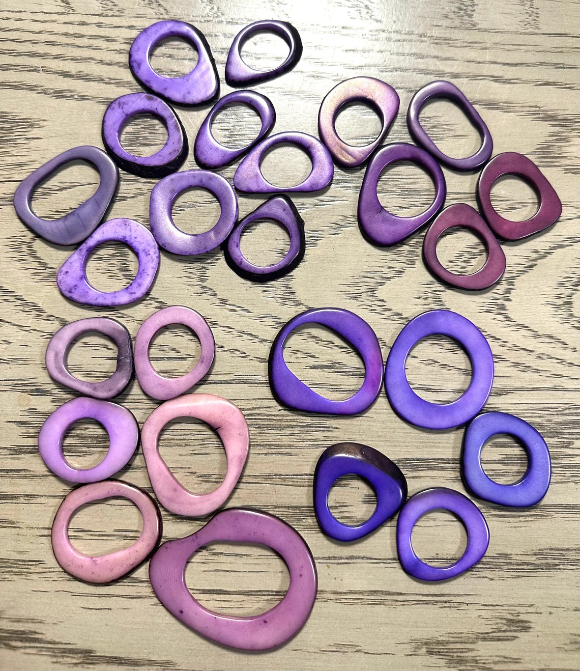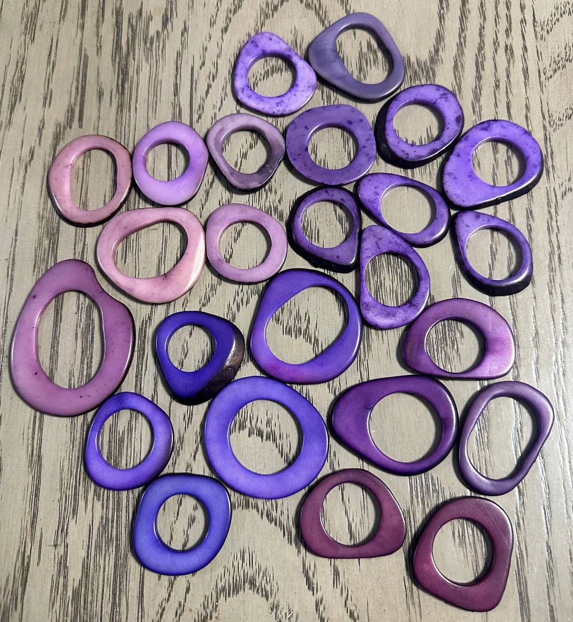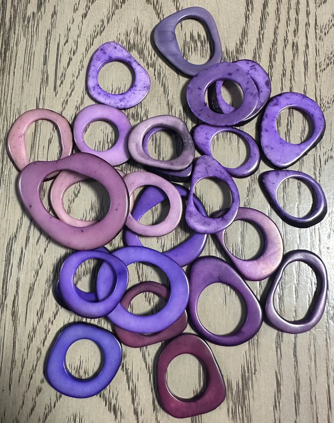 Tagua beads. Mix of purple, lilac & plum. Tagua hoops, donuts, rings, discs. 20 rings of tagua. 4x3.5 cm. approx. Drilled or Undrilled.