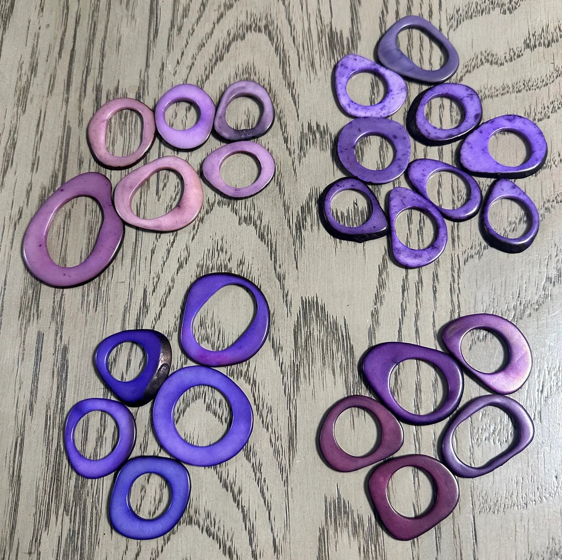 Mix of purple, lilac and plum tagua hoops - donuts - rings. 20 discs of Tagua from Colombia. Size: 4 - 4.5 x 3 - 3.5 cm. Drilled or Undrilled.
