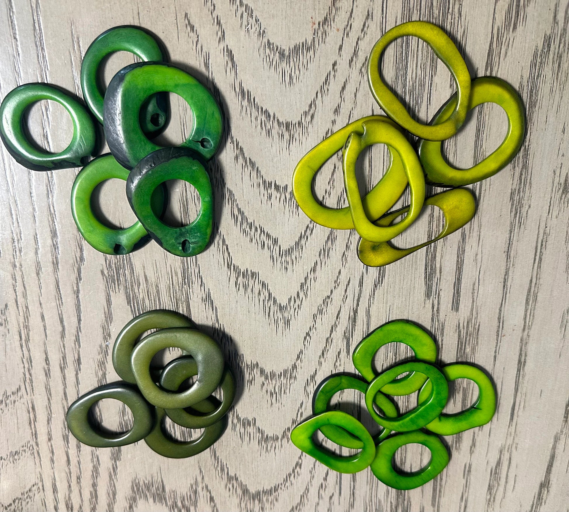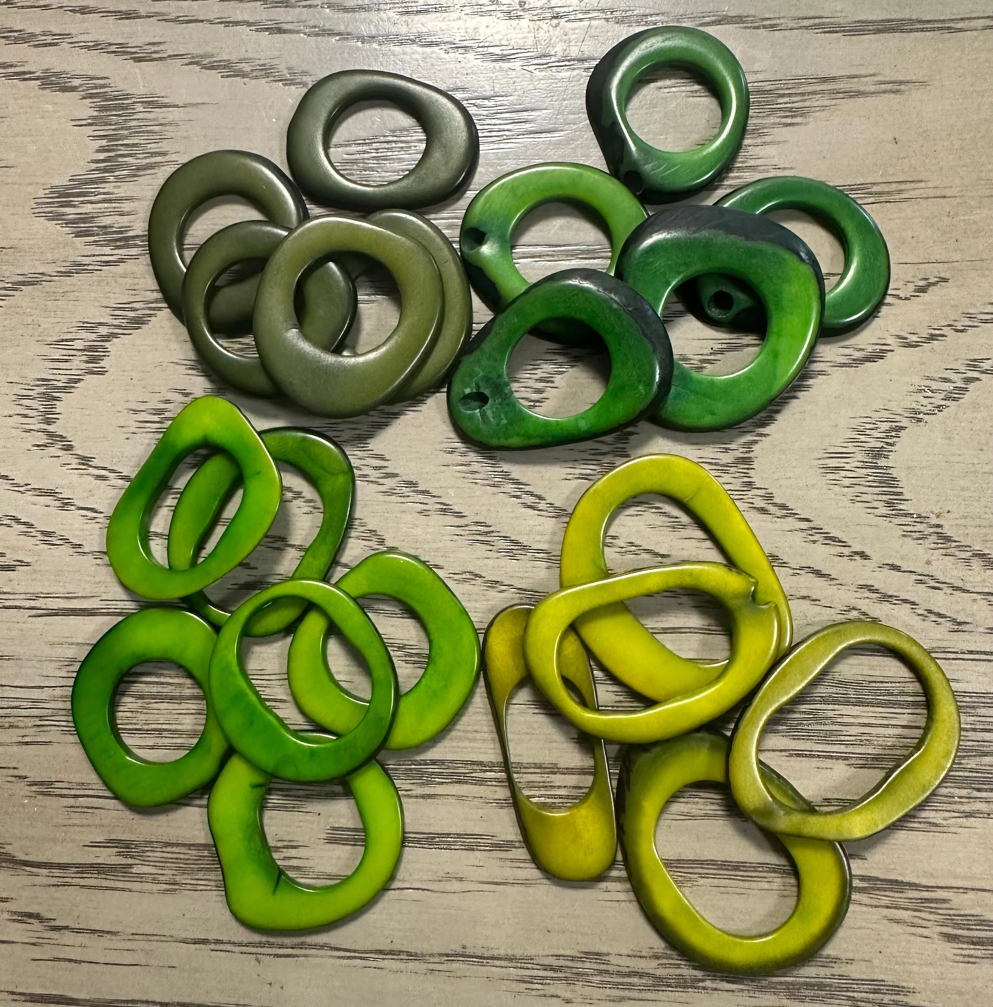 Mix of Green Tones Tagua Hoops - Donuts - Rings. 20 Discs of Tagua from Colombia. Size: 4x3.5 cm. approx. Drilled or Undrilled. Free Shipping.