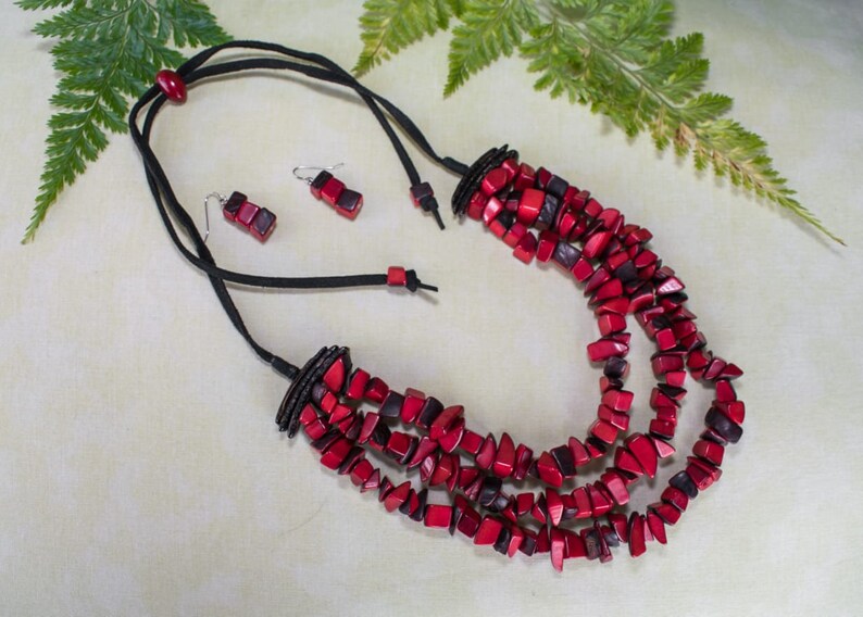 Tagua Necklace, Earrings and Bracelet Set in Red Color.
