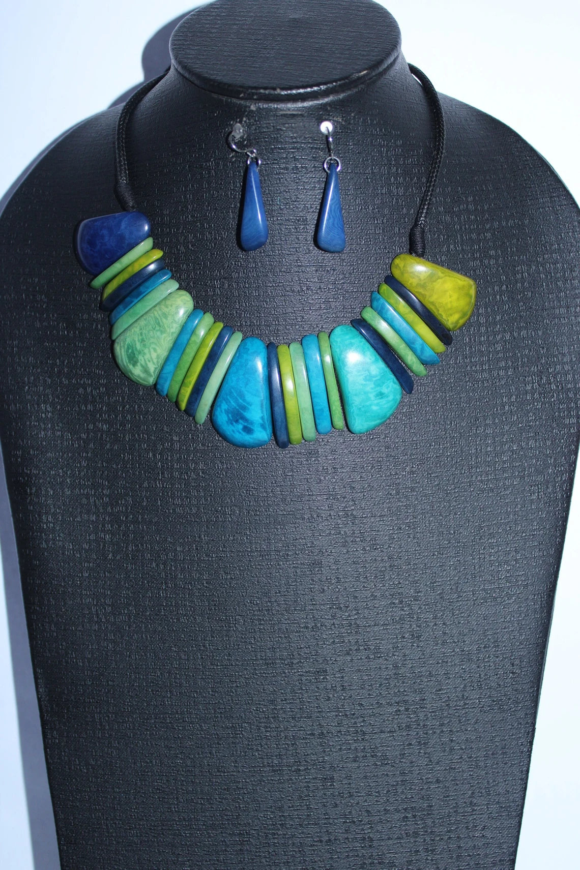 Tagua Set of Earrings and Necklace with green and blue, sticks. Handmade. Natural jewelry. Organic.