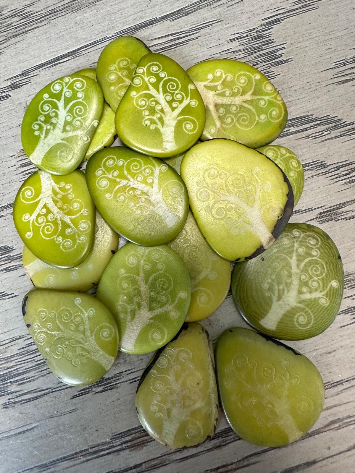 Tagua Nut Beads Laser Engraved Tree Shape 15 Tagua Slices Mix of Green 3.5x3.5 cm. approx. Eco Sustainable Jewerly Making Woodwork Carving
