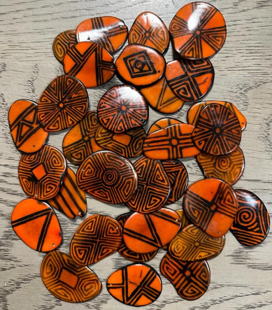 Tagua Slices, Tagua Chips. 20 Orange and Black Pattern. 15 Beads. Mix of Orange Patterns. Handpainted. Natural Jewelry Supplies. Top Drilled