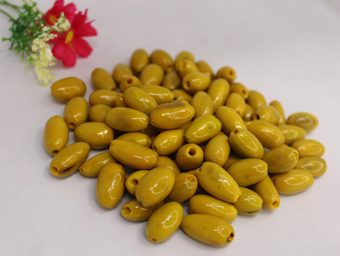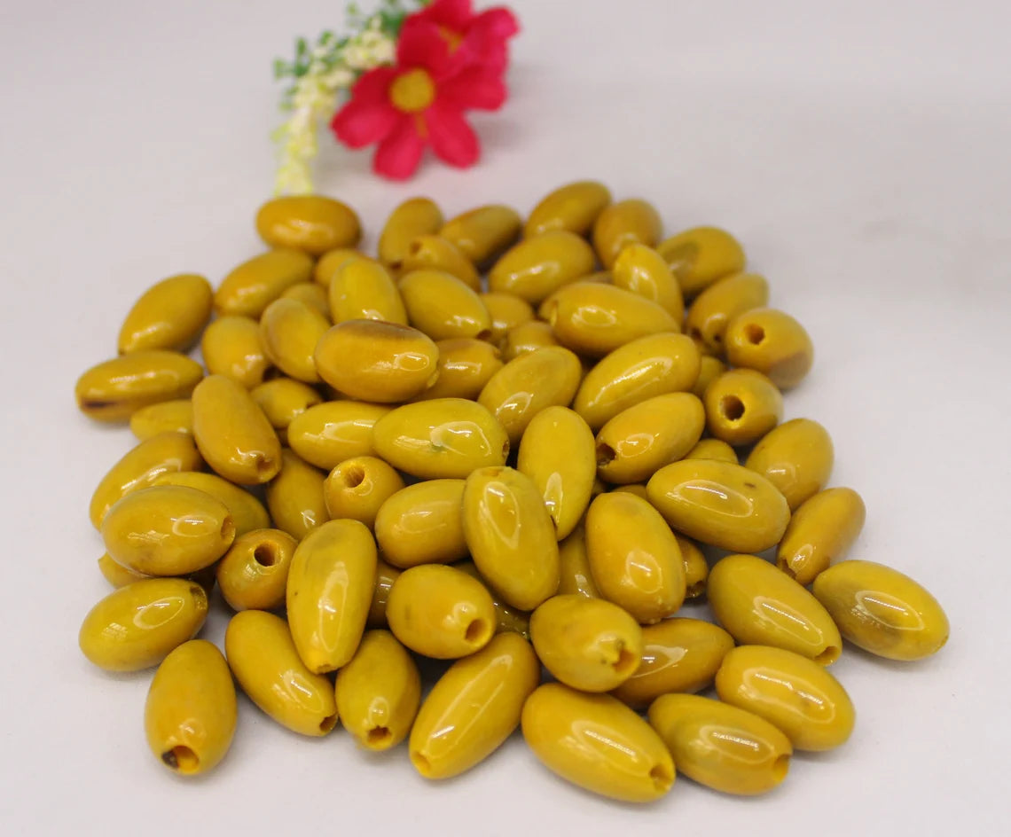 Yellow mustard beads made of camajuro seeds from Colombia. Size: 2.5 x 1.5 cm. approx. Natural beads. Pack of 30 beads. Free Shipping.